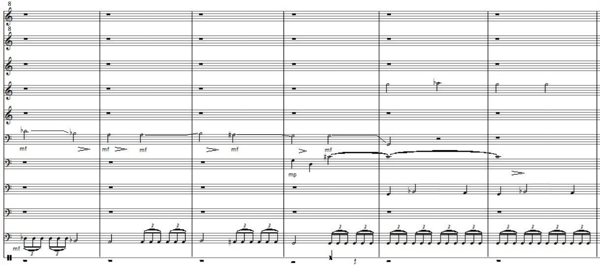 as below and transcribed from the CD. In 2025 I've tried to write out this example with more of its details, as above. The part between brackets of the Celli/CB staff