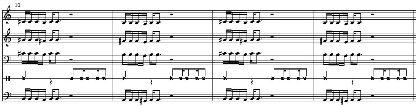 Two drummers are playing as well. Usually I don't include the drum part, but for bars 10-17 I've indicated the beats (see the main text for the reason).